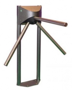 Стойка турникета выполнена в виде сдвоенной вертикальной системы из стальных 48 мм труб с заглушками на стальном 12 мм фланце. Через трубу прокладывается кабель управления . Фланец крепится к полу на четыре болта М10/70.
